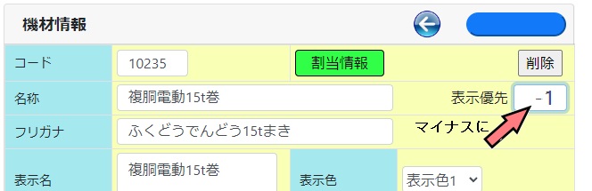 機材管理 及び 人員管理より、表示優先をマイナスにする。
